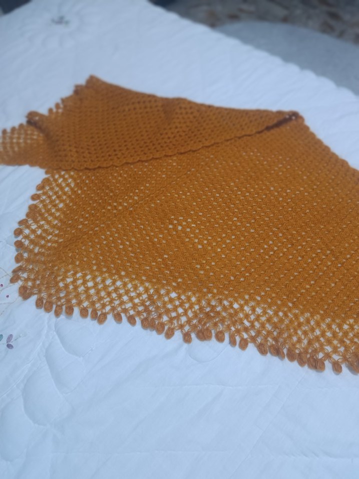 Kadınlar için örgü, parlak bej tonunda bohem tarzda şal. Rahat dokusu ile retro ve hippie stillerine uygundur.