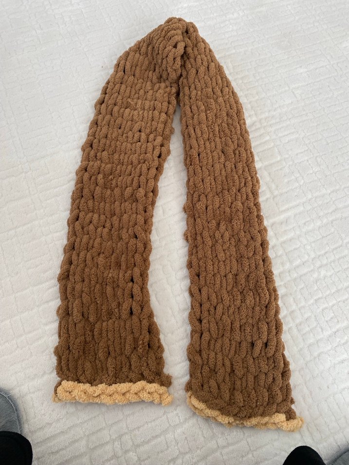 Kadınlar için örme dokulu, kahverengi ve yumuşak dokulu atkı. Kenarında bej renkli ince detay vardır. Bohem tarzıyla sade ve temel kombinlere uygundur.