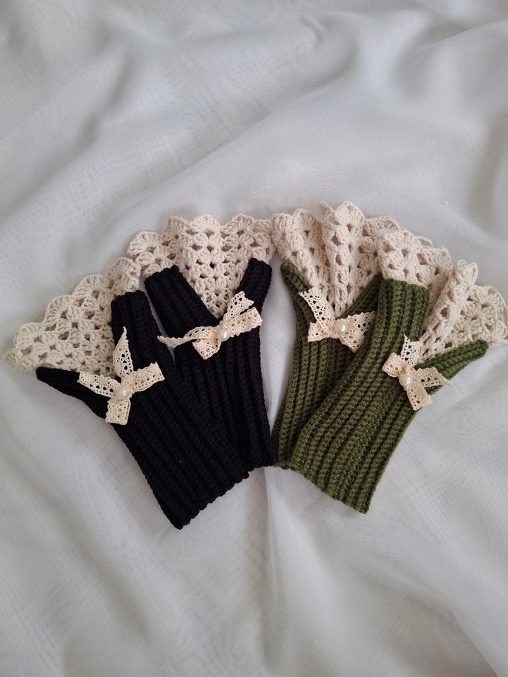 Kadınlar için örgü eldivenler, koyu haki renginde ve rahat goth tarzında, ince dantel fiyonk detaylıdır.