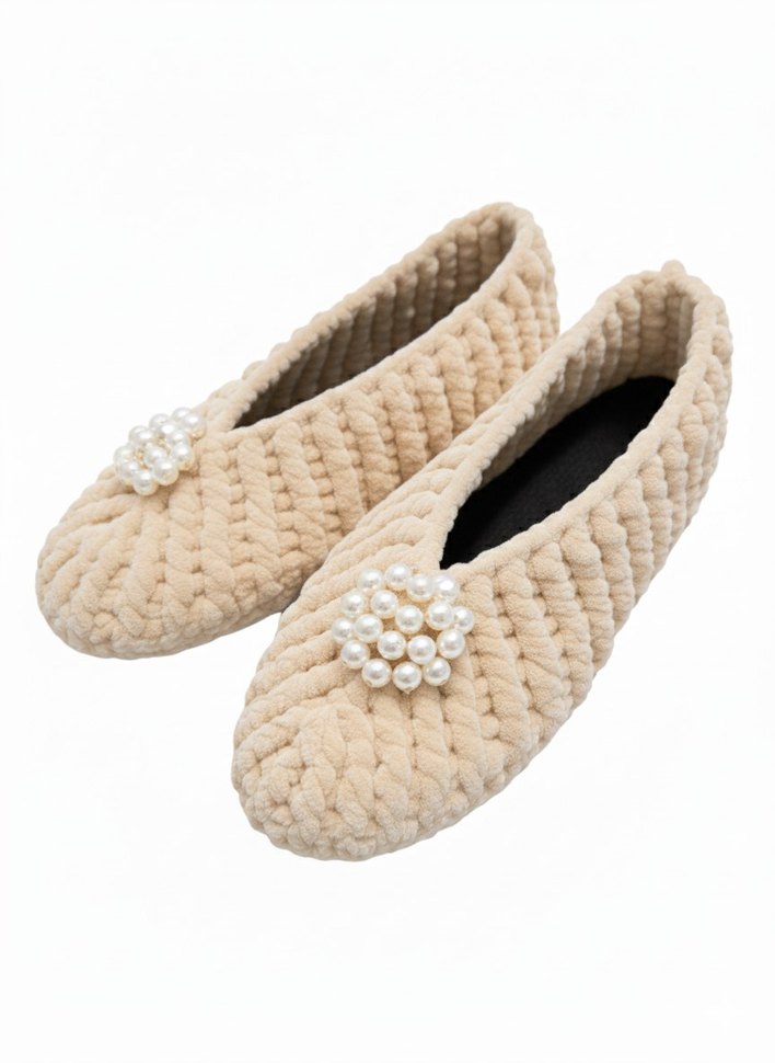 Kadınlar için örgü, blok topuklu ev terliği. İnci işlemeli detayları ve pastel beyaz rengiyle günlük kullanıma uygun klasik şıklık sunar.