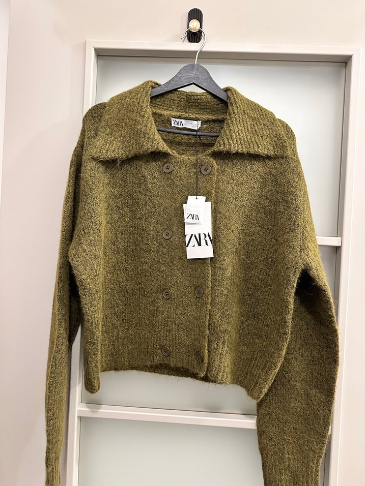 örgü yün hırka, bol kesim, uzun kollu ve yuvarlak yakalıdır. Kısa boyda, sade ve rahat günlük sokak stiline uygundur. Zara marka ve 'AR' etiketi bulunur.
