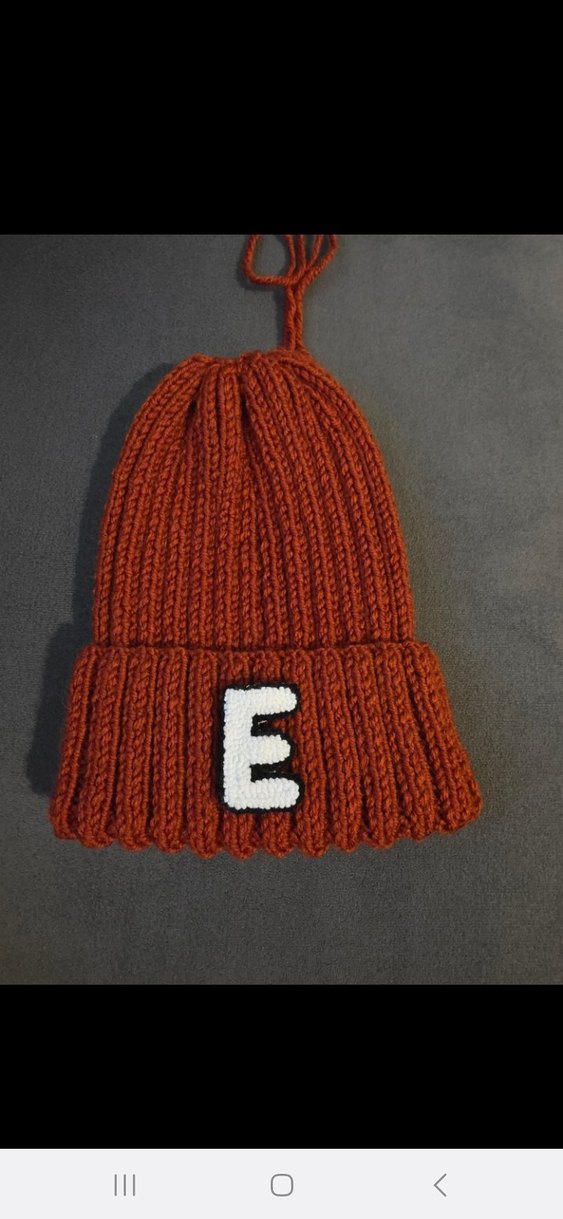 Yumuşak örgü kumaştan yapılmış, önünde beyaz "E" harfi bulunan kahverengi örgü bere. Rahat sokak stili için uygun.kişiye özel istenilen harflerde örülmektedir