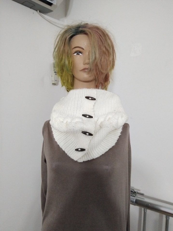 Kadınlar için beyaz renkte, düğmeli örgü tasarıma sahip rahat atkı. hiç kullanılmadı