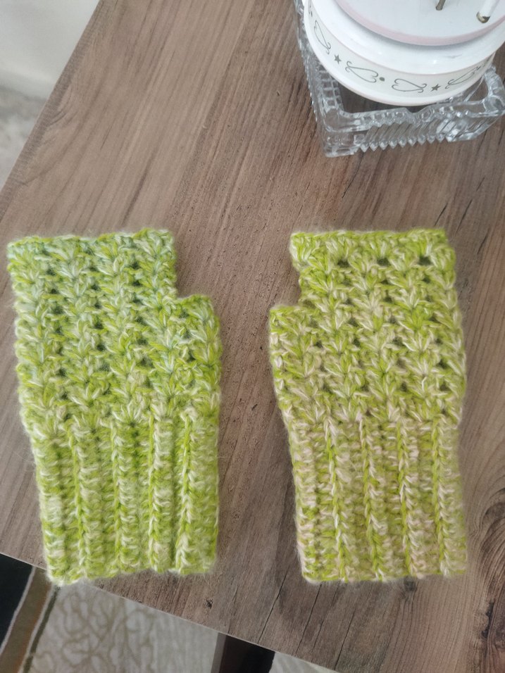 Kadınlar için örme, parmakları açık, yumuşak ve rahat yeşil renkte eldivenler, sade bohem tarzda.