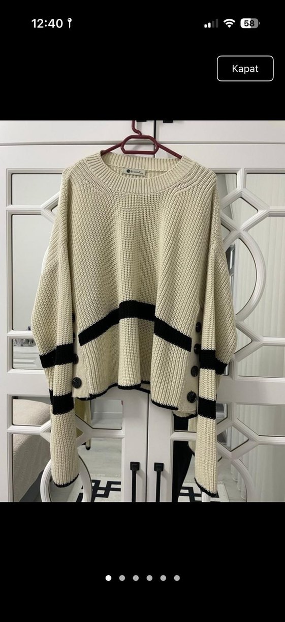Salaş kesim, uzun kollu örgü kadın kazak, siyah çizgiler ve düğme detaylarıyla. Rahat sokak stili için uygundur. Std bedendir M L rahat olur.