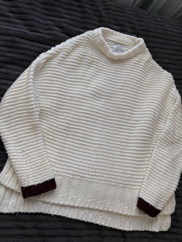 Kadınlar için gevşek kesim, bisiklet yaka ve uzun kollu örgü kazak. Düz beyaz renkte, koyu manşet detaylı, günlük sokak stili için uygundur.