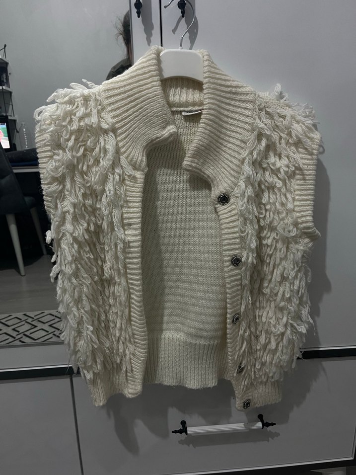 Kadın örgü yelek, yüksek yakalı ve salaş kesimlidir. Yanlarda dokulu detaylar bulunur, yumuşak örme kumaştan yapılmıştır. Günlük kullanım için uygundur.