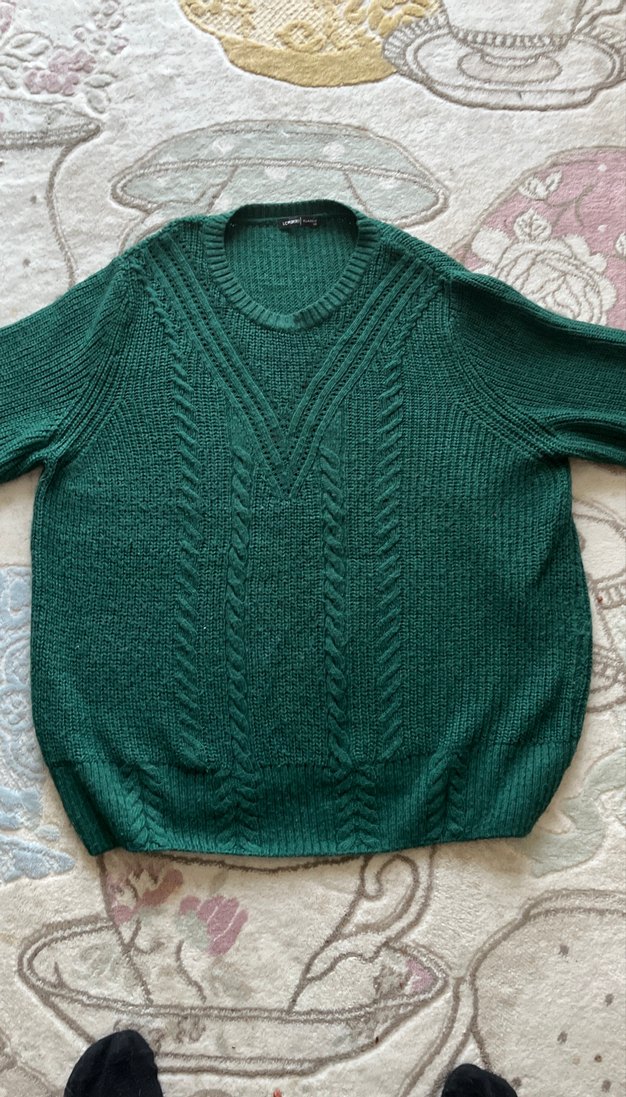 Koyu yeşil renkte, yuvarlak yaka ve uzun kollu, bol kesim örgü kazak, rahat ve bohem tarzda günlük kullanım için uygundur.