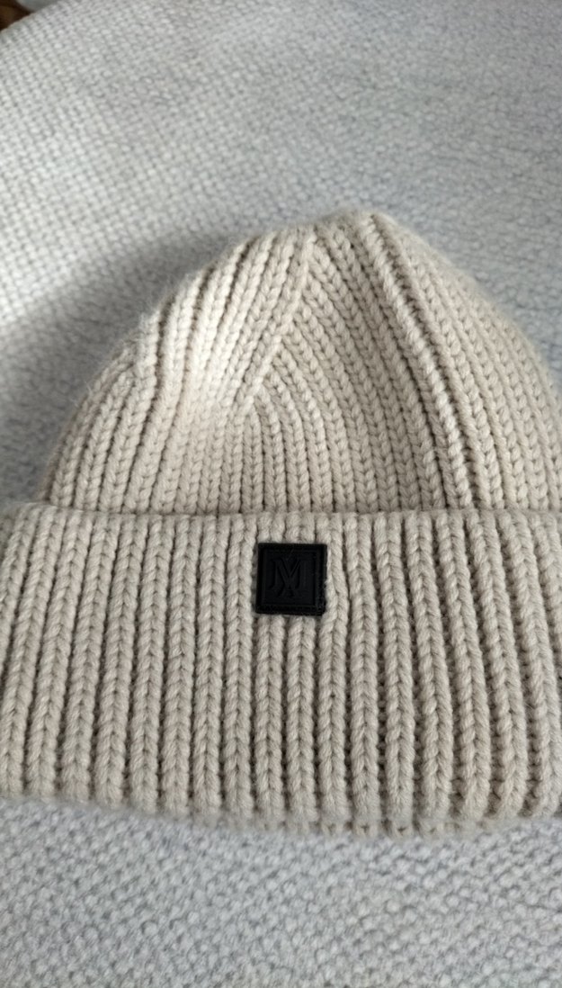 Kadınlar için yumuşak yünden örülmüş, krem renkte, katlanabilir manşet ve küçük siyah etiket detayına sahip sade sokak stili bere.