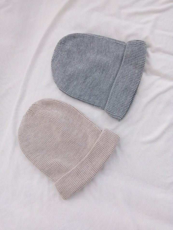 Gri ve bej renklerde, örgü yünden yapılmış iki kadın bere. Sade ve çağdaş tarzda, rahat ve sıcak tutar.