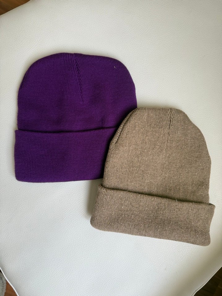 Mor ve gri renklerde örgü yün bere, rahat ve sade tarzda, karşı kültür havası taşıyor. Yumuşak ve sıcak tutar.