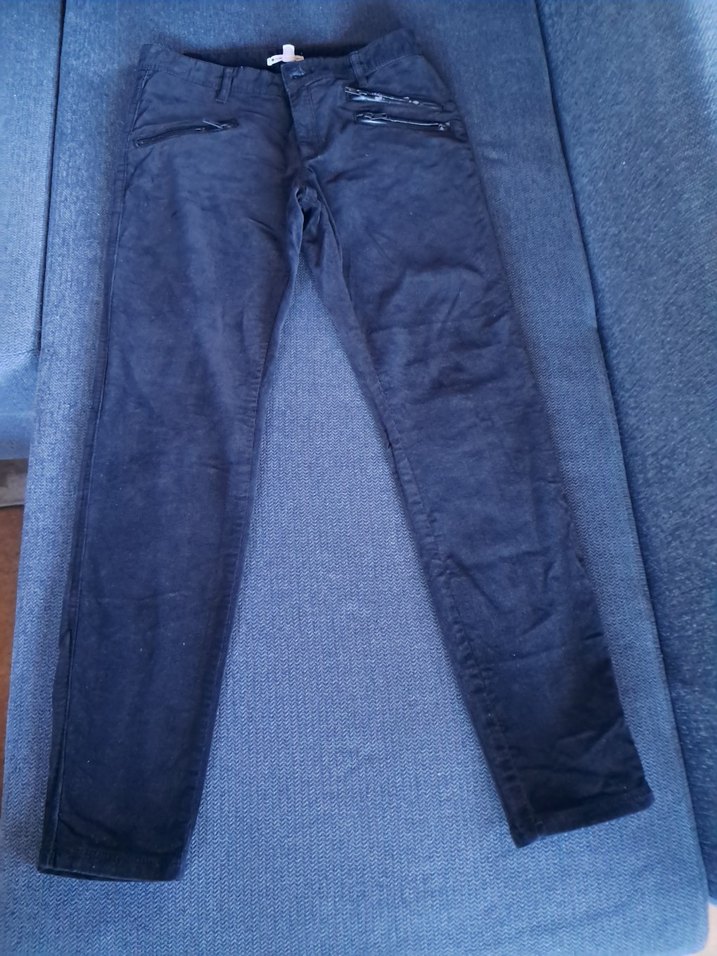 Kadınlar için siyah renkte, normal boyda,dar paça ve regular fit kesime sahip ince fitilli kadife pantolon. 1 kere giyilmiş ve yıkanmıştır.Fermuarlı cepleri bulunur.Saklama esnasında,cep biyesi suni deri olduğundan soyulmuş olup günlük kullanıma uygundur. Onun dışında kusur yoktur.Basen95cm Paça13 cm