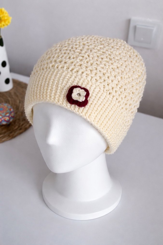 Beyaz örme kadın bere, küçük dekoratif çiçekle bohem tarzına uygun rahat dokuda.