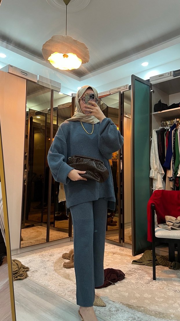 Kadınlar için rahat, loose fit, mavi renkli denim örme takım. Yüksek yakalı ve uzun kollu, uzun boyda,sokak stiline uygun.