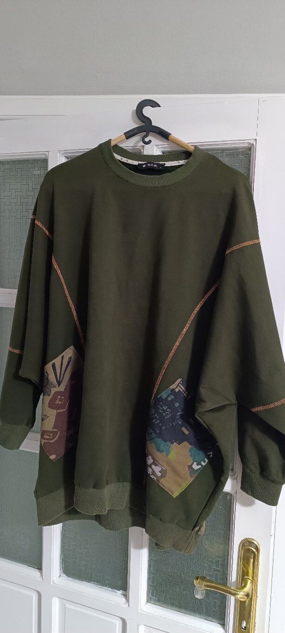kadınlar için, uzun kollu, yuvarlak yakalı, oversize kesim triko sweatshirt. Koyu haki renkte, iki baskılı cep detaylı, günlük ve sokak stiline uygun. L beden 3-4 kez giyildi temiz kullanılmış bir sorunu yoktur