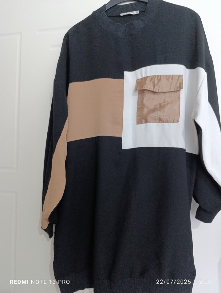 Siyah, bej ve beyaz renk bloklu baskılı, uzun kollu, oversize kesim sweatshirt. Günlük sokak stiline uygun yumuşak sentetik kumaştan üretilmiştir.