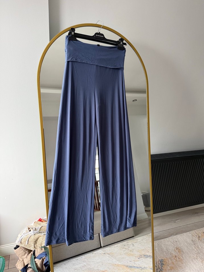 Kadınlar için geniş kesim, mavi renkte, ipeksi kumaştan ve drapeli tasarıma sahip uzun pantolon. Günlük kullanıma uygun, minimal ve çağdaş stil sunar.