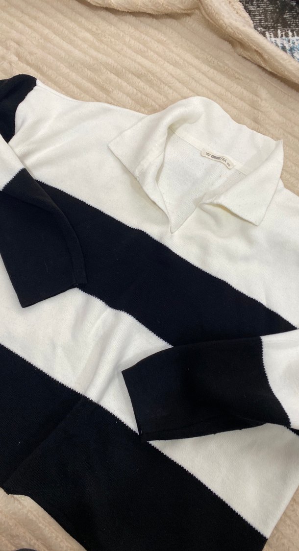 Kadın pamuklu triko kazak, uzun kollu ve kayık yaka. Gevşek kesim, çizgili deseni ve midi boyuyla günlük rahat kullanıma uygundur.