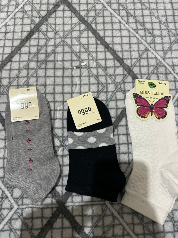 Pamuklu yumuşak kumaştan yapılmış, gri, siyah beyaz puantiyeli ve beyaz renklerde kadın çorabı. Desenli ve tek beden. Oggo ve Miss Bella markalı. Fiyat tek ürün için geçerlidir hepsi aynı fiyatdır