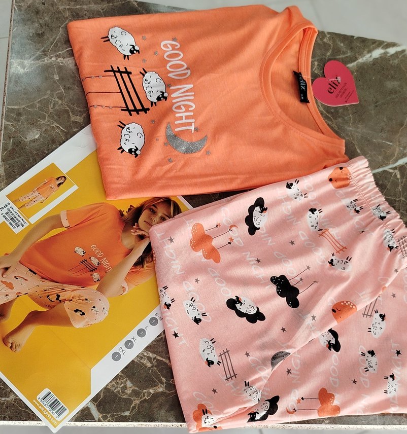 Yumuşak pamuktan, renkli baskılı koyun figürleri ve "GOOD NIGHT" yazısı içeren pembe kadın pijama takımı. Rahat gece kıyafeti.
