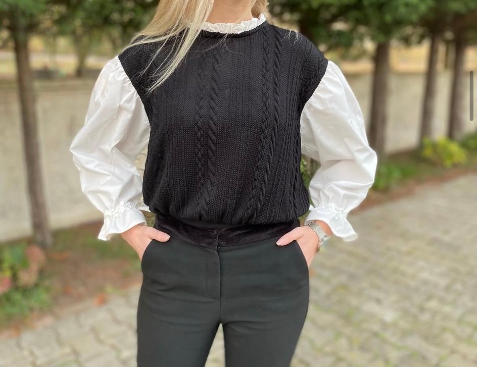 Örgü siyah gövde ve beyaz uzun kollu pamuklu, salaş kesim kadın triko kazak. Goth tarzı günlük kullanıma uygun şekilde bir arada. Son fotoğrafta defosu mevcut