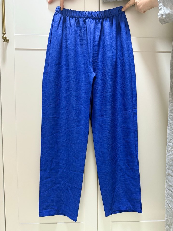 parlak mavi, satenimsi krep kumaştan yapılmış,bol kesim beli lastikli pantolon Günlük kullanım için uygundur. Son derece rahat tril trildir hiç giyilmedi 0 üründür defosu yoktur