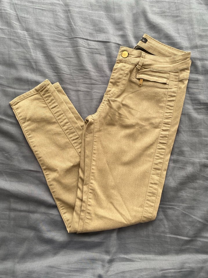 Düğmeli, bej renkli süet kumaştan yapılmış, normal boy midi kesim, sokak stiline uygun kadın pantolonu. Günlük kullanıma uygundur.