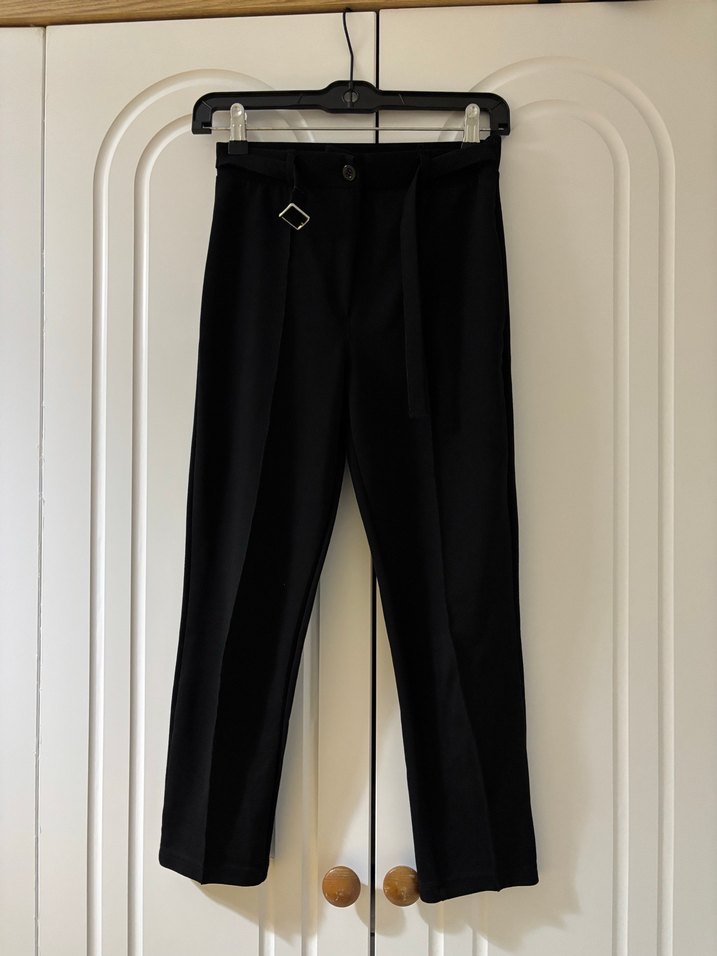 Kadınlar için siyah pantolon, normal kesim ve midi boyda. Kemer detay ve goth tarzıyla kullanımına uygun.