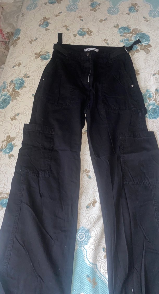 Kadınlar için siyah denim pantolon, bol kesim ve midi boyda. Kemerli tasarımıyla sokak stiline uygun, günlük kullanıma ideal. Defosu yoktur