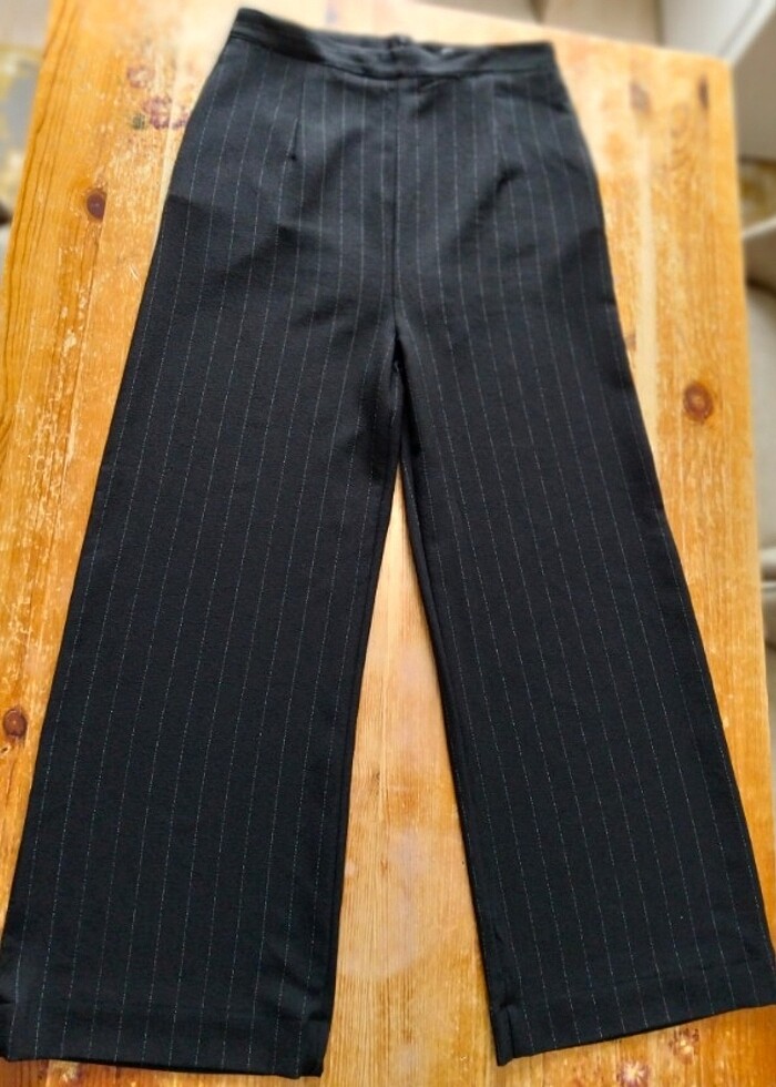 Kadın beyaz çizgili siyah pantolon. Robin marka, 40 beden, paçanın içinde payı var.