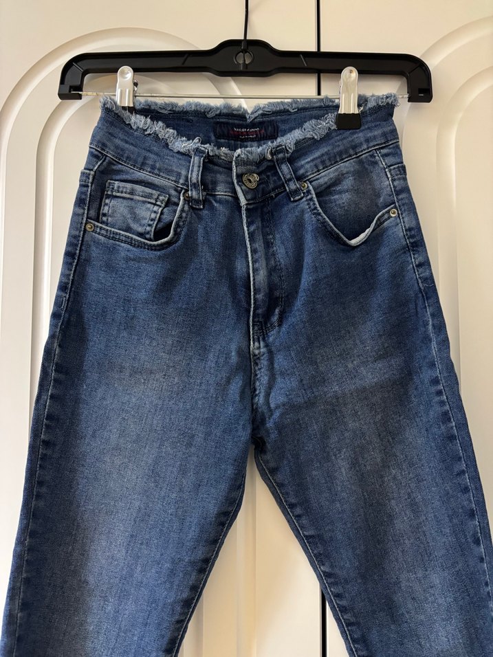 Düğmeli, normal kesim mavi denim kadın pantolon, günlük kullanıma uygun rahat bir tasarıma sahiptir.