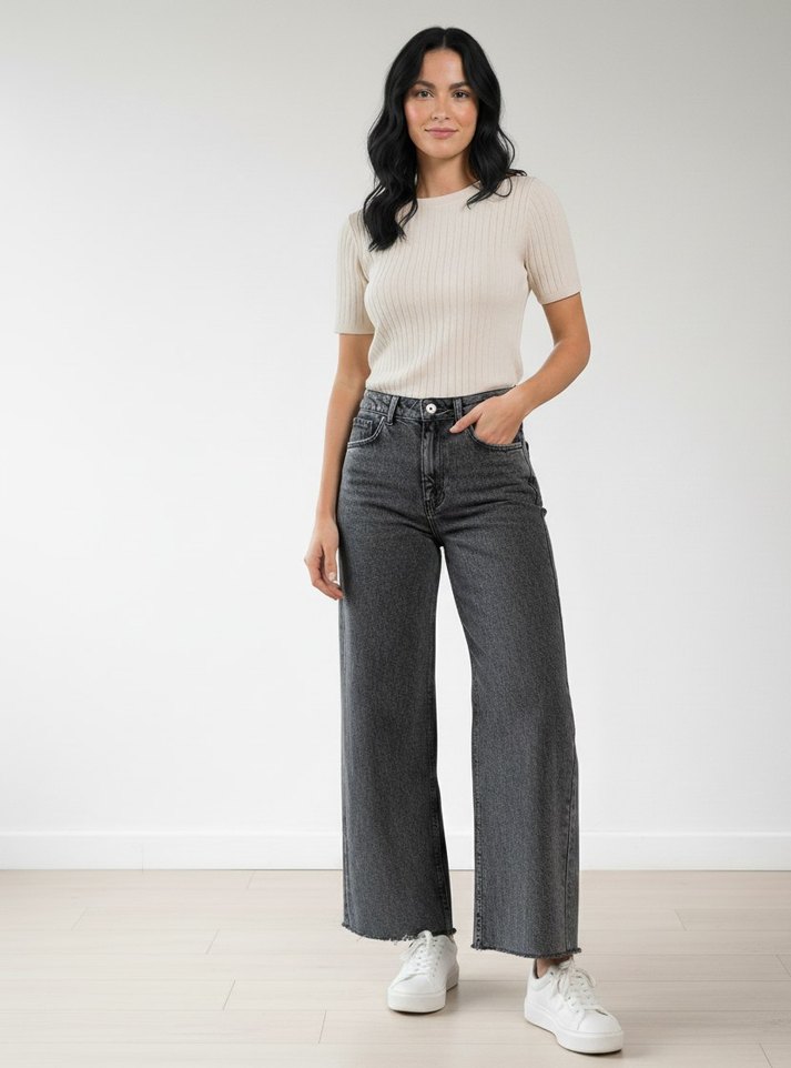 Gri renkli, midi boy, regular fit kesime sahip, desen içermeyen denim kumaştan günlük kullanıma uygun rahat kadın jean. marka temsilidir