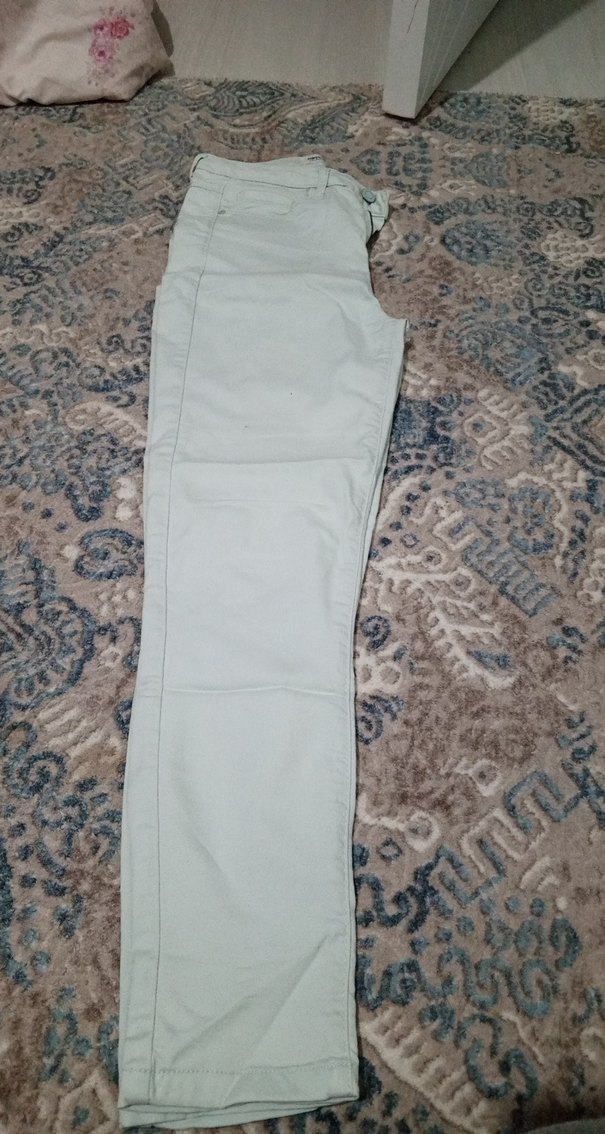 açık mavi renkte, normal pantolon. Sentetik kumaştan,