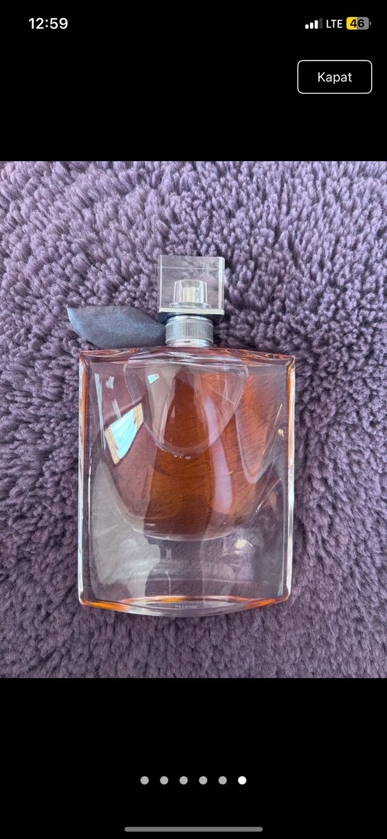 Şeffaf dikdörtgen tasarımlı, gümüş sprey başlıklı kadın parfümü şişesi, boyun kısmında küçük gri kumaş detayı bulunur. İçinde açık pembe sıvı vardır.