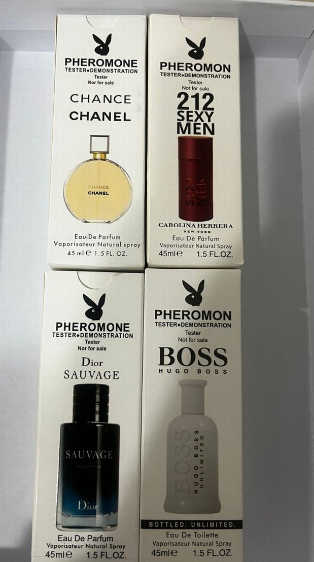 Chance Chanel, 212 Sexy Men, Dior Sauvage ve Hugo Boss Boss tester parfüm seti, 4 adet 45 ml Eau De Parfum içerir. Feromon etkili.