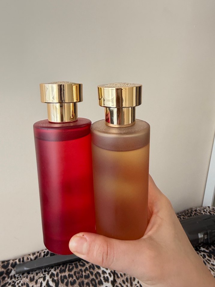Altın kapaklı, mat cam şişelerde kırmızı ve bej tonlarında 2'li kadın parfüm seti. Farklı kokular için uygun.