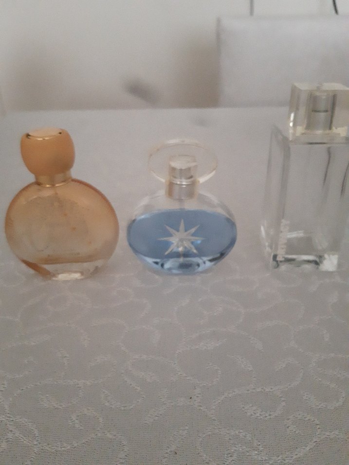 Boş Şişe Yuvarlak amber, yıldız desenli mavi ve şeffaf dikdörtgen şişelerden oluşan 3 farklı kadın parfümü seti.