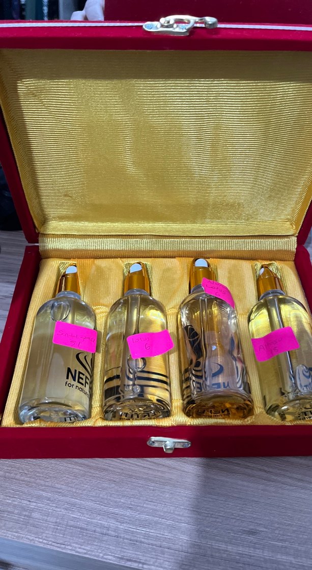 Kırmızı kutuda, altın renkli kumaş astarlı, dört adet kadın parfümünde kullanılan esans. Mısırdan alındı. Orjinal