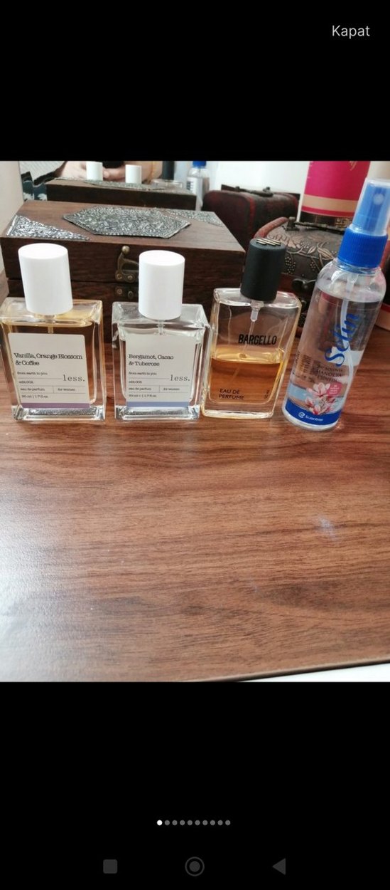 Vanilya, portakal çiçeği, bergamot ve kahve gibi kokuları içeren 4 parçalı kadın parfüm seti. Kolay kullanım için sprey şişe ile birlikte. Resimde görüldüğü üzere bazıları biraz kullanılmıştır.