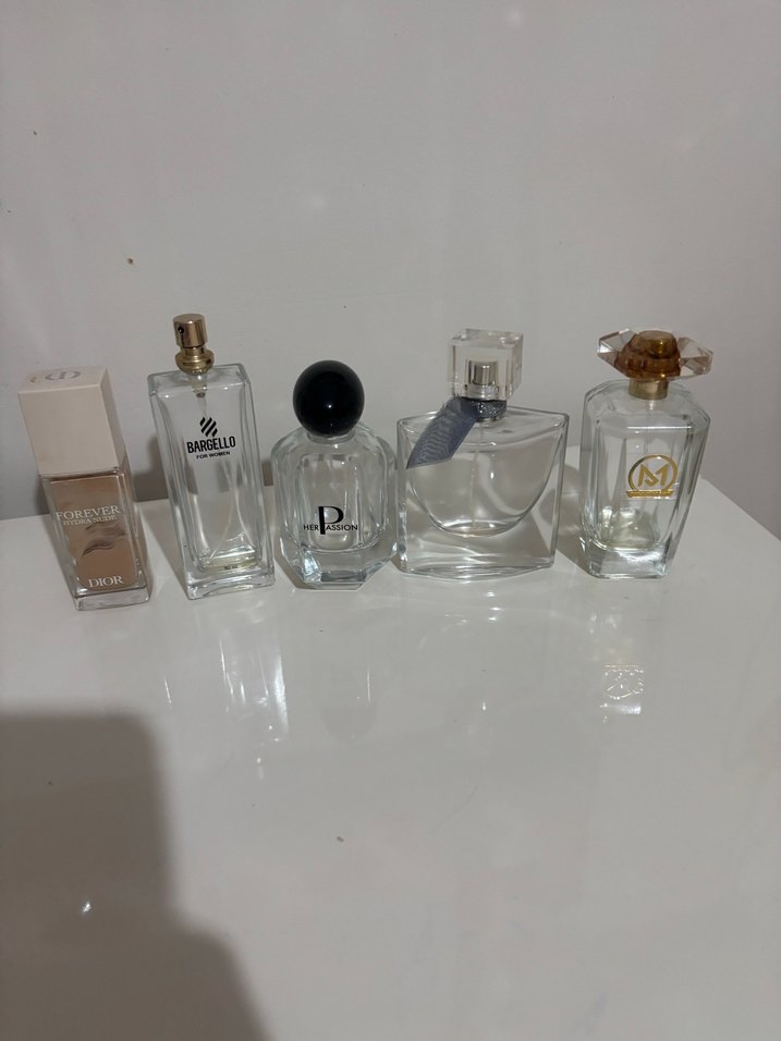 Farklı markaların boş cam parfüm ve fondeten şişeleri