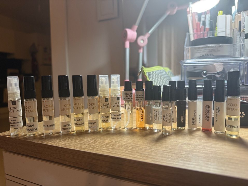 Muscent koku mutfağı ve beligaya ait cogu tam dolu olan mini parfumler. Bastakiler 5ml gorselde belli oluyor tam dolular. Sondakilerde 3ml cogu tam dolu bazisi yarim gosterdim. Muscentin kendi ozel serisine ait 2 kokunun da deneme boyu var. Toplu satiyorum.