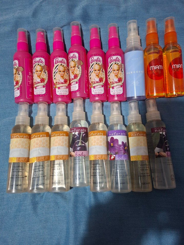 Barbie temalı spreyler, Naturals vücut parfümleri ve diğer çiçeksi, meyvemsi kokulardan oluşan kadın parfüm seti. Renkli tasarımlı sprey şişeleri.
