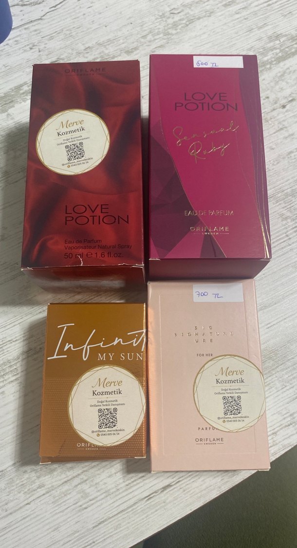 Oriflame markasına ait Love Potion ve Infinity My Sun kokularını içeren 50 ml'lik dört kadın parfüm seti. (4lü set)