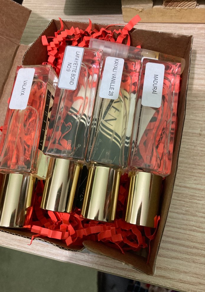 Madurai, Kayal Vanille 28, Lafayette Bond No. 9 ve Vilaya etiketli, altın kapaklı kadın parfüm seti. Kutuda kırmızı dekoratif dolgu ile sunulur. Ayrı sorabilrsnz
