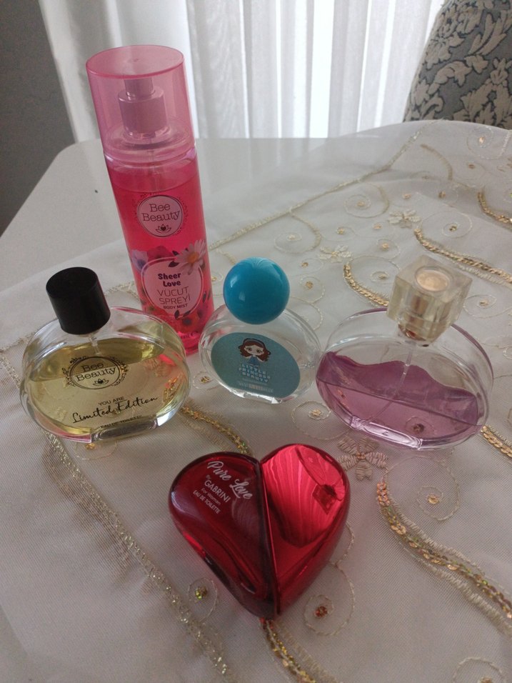 Farklı şişe tasarımlarına sahip kadın parfümleri ve vücut spreyi seti, kalp ve yuvarlak şişeler içerir. Hepsinin çoğu dolu..
