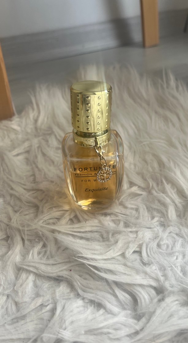 Fortune Exquisite kadın parfümü, altın kapaklı ve süslü küçük bir aksesuarla birlikte, sıcak kehribar renkli kokusu ile öne çıkar.
