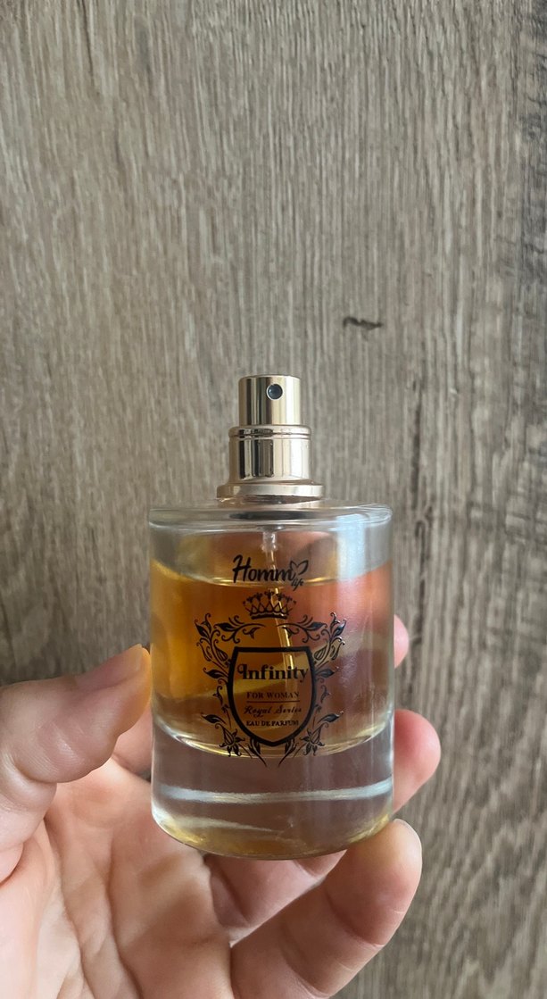 Homm? Infinity kadın parfümü, şeffaf cam şişede altın renkli amber sıvı ve gümüş renkli sprey başlık içerir. Kesinlikle Orijinaldır az kuallandım