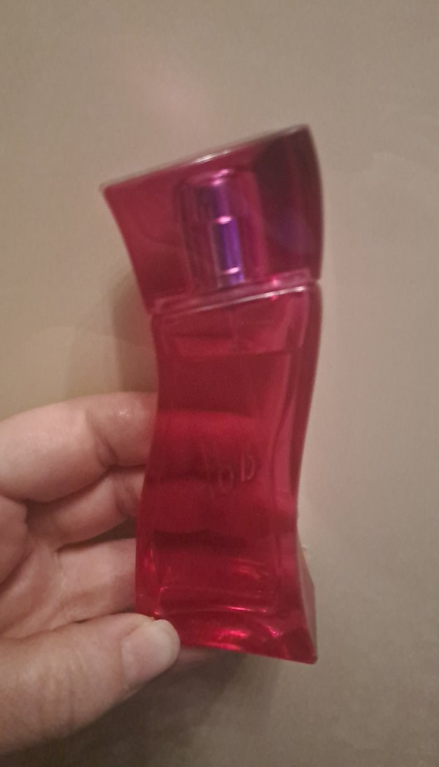 sprey kapağı ve kıvrımlı tasarıma sahip kırmızı şişede kadın parfümü.