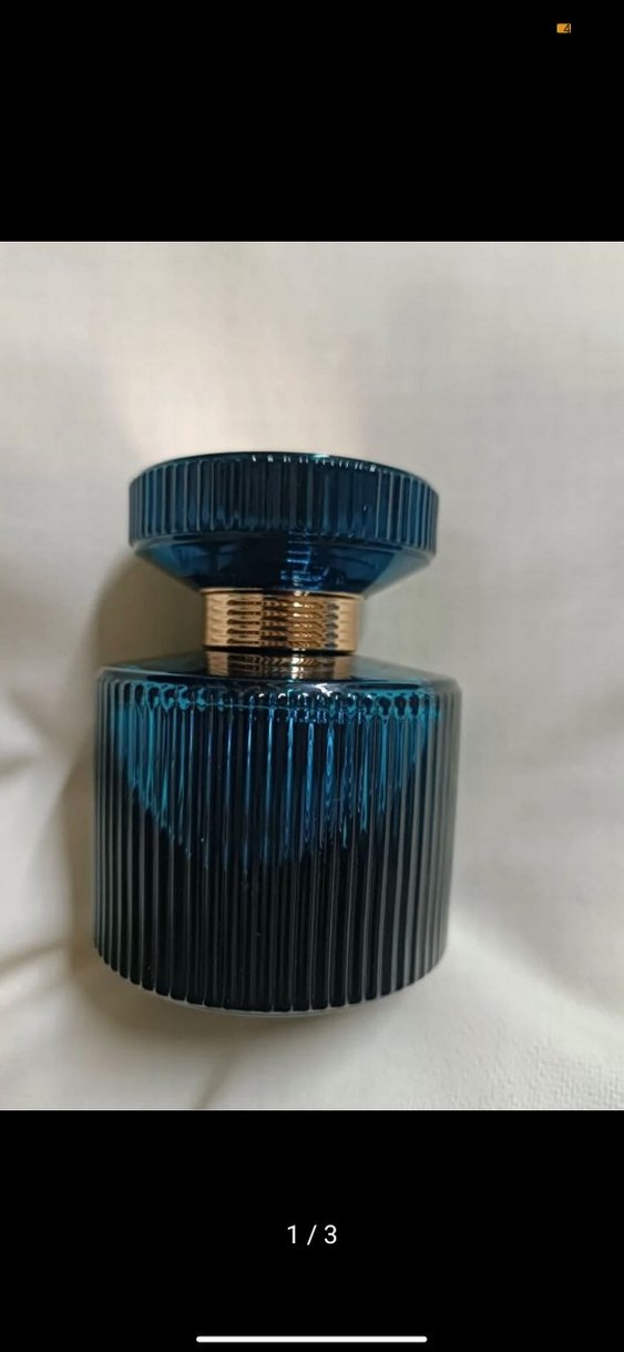 Kadın parfümü, altın detaylı boyun kısmı ve kabartmalı derin mavi şişede sunulmaktadır.