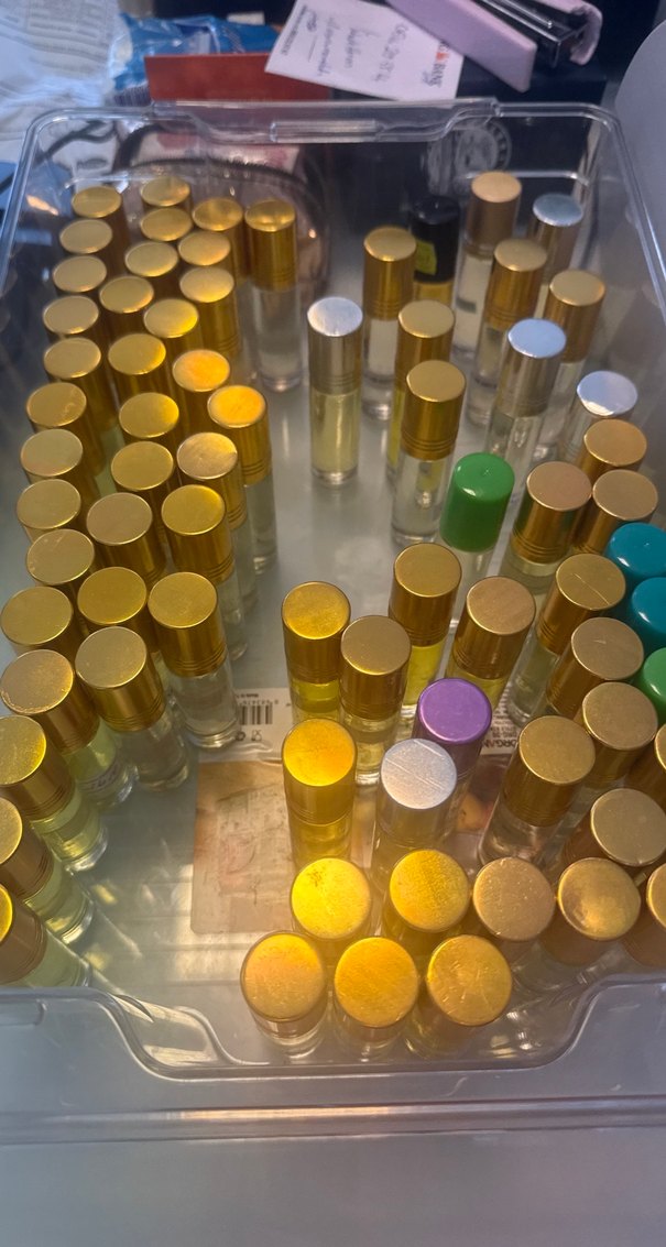 Çeşitli renkli kapaklara sahip, altın tonlu kapaklı ve şeffaf cam şişelerden oluşan kadın parfümü mini seti. Farklı kokuları denemek için uygun.